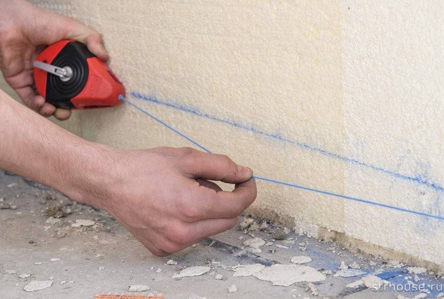 Если же возможности воспользоваться лазерным уровнем нет, для построения прямой линии пользуются окрашенным отбивочным шнуром. Отбивочный шнур прикладывается по уровню в двух точках стены, натягивается и бьется об стену, оставляя на ней след.