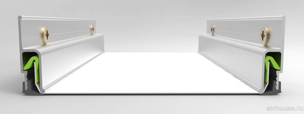 Несущим конструктив – специальный профиль (багет), установленный по верхним углам помещения. Устройство натяжного потолка предполагает, что края ПВХ-полотна имеют гарпун, который заводится в крепежный профиль. Изначально пленка просто подвешивается, затем разогревается с помощью тепловой пушки. Будучи разогретым, она становится эластично, что позволяет ее натянуть. По всему периметру гарпуны защелкиваются в багете, а чтобы скрыть внутренние крепежные элементы, устанавливается защельник – декоративная планка-заглушка. В результате натяжной потолок становится идеально ровным.