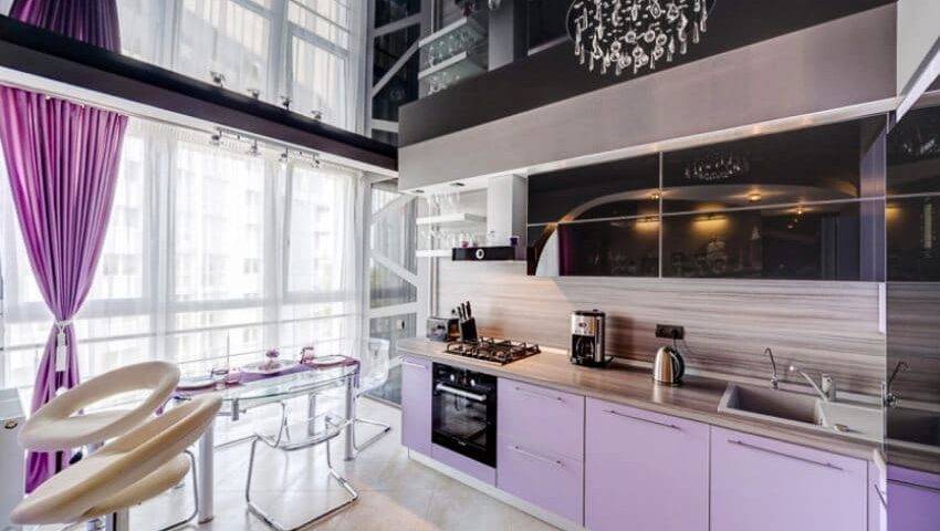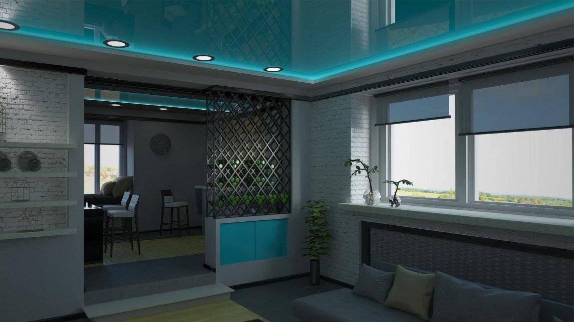 Зонирование кухни с натяжным потолком с помощью освещения