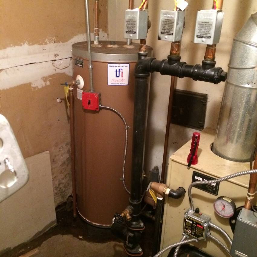 Накопительный водогрей косвенного типа на 150 литров. Напор воды на входе может достигать 6 атмосфер. Нагревает жидкость до 85 градусов. Управление механического типа. Имеются индикаторы включения и нагрева, а также термометр.