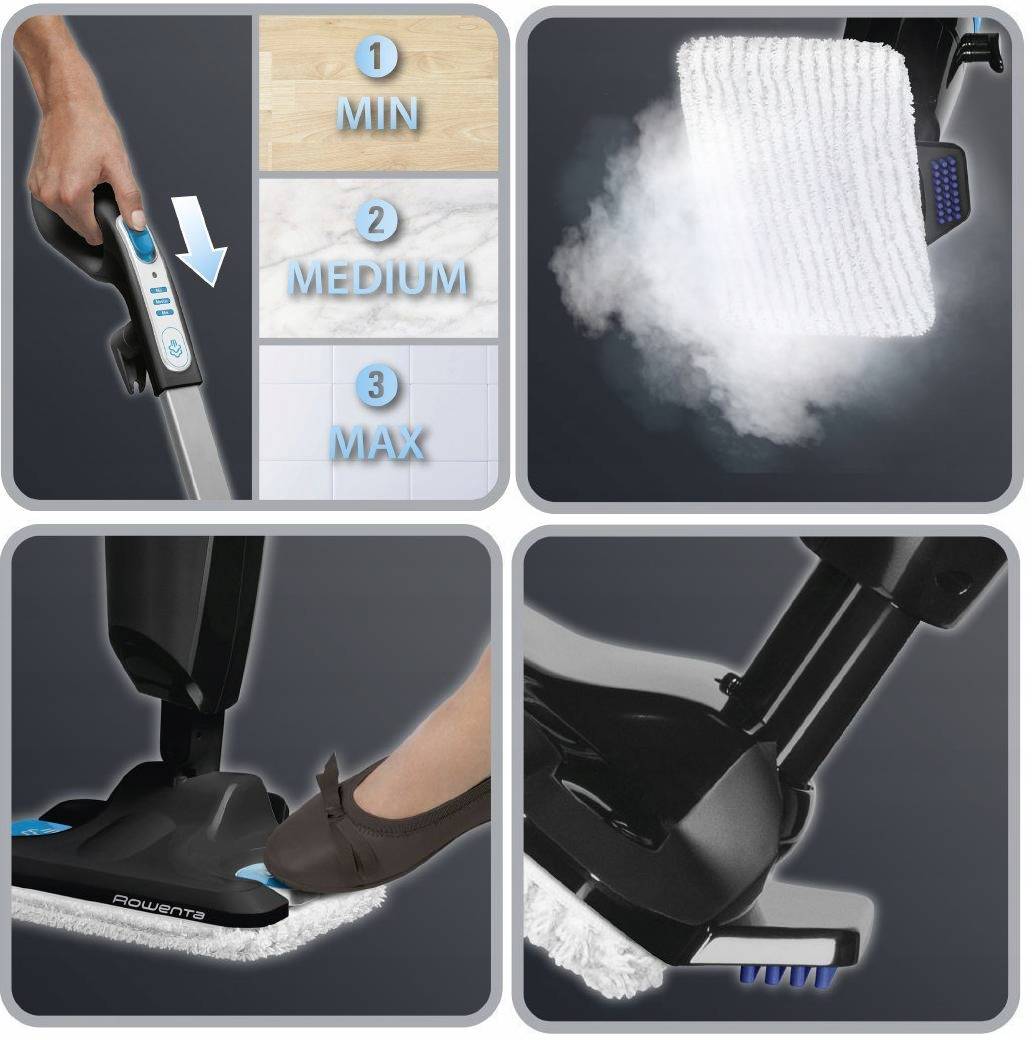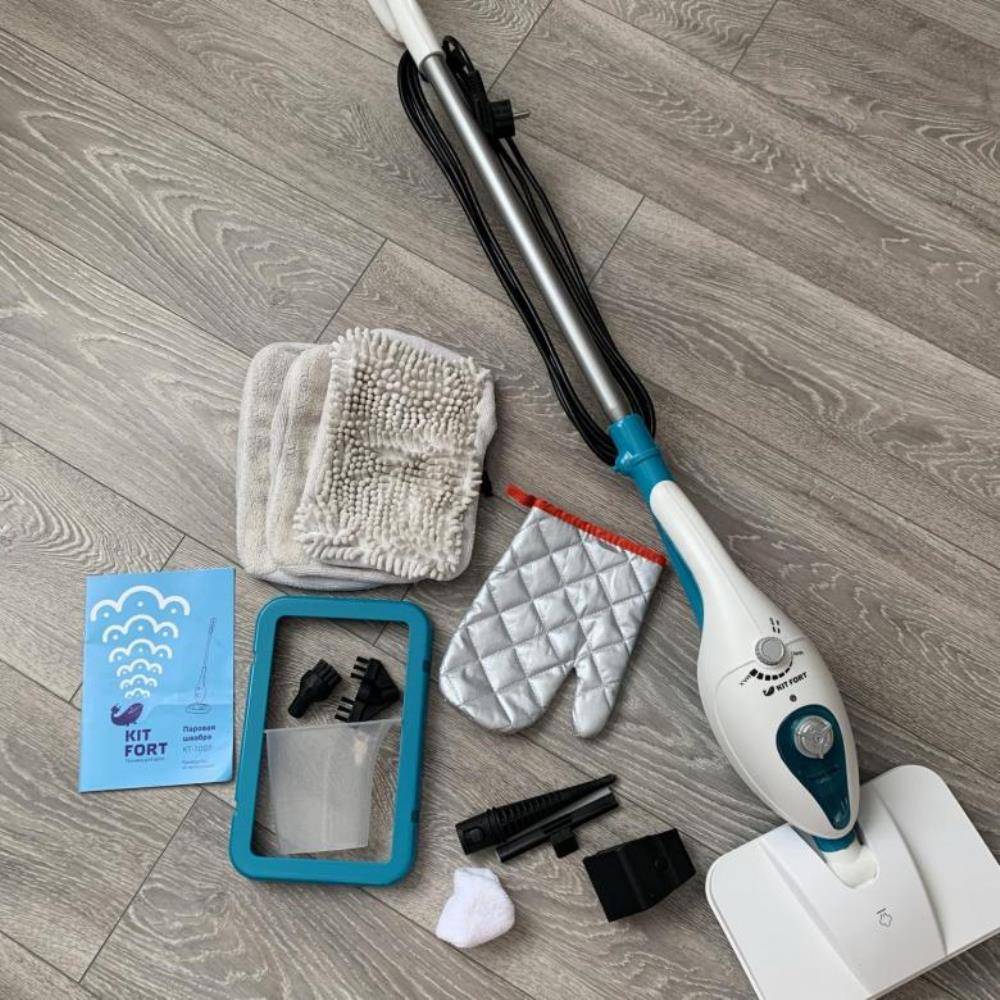 В комплектацию швабры входят 4 функциональные насадки, способные с легкостью трансформировать заявленное устройство, например, в пароочиститель. Резервуар для воды объемом 0,4 л позволяет убирать квартиру до 5 раз без замены или пополнения жидкости в баке. Устройство очень мощное, в 1300 Вт, поэтому начинать уборку квартиры можно уже спустя 30 секунд после включения прибора. Напольная насадка выполнена в виде треугольника, что позволяет ей проникать даже в труднодоступные места. С помощью этой швабры вы сможете эффективно чистить углы и напольные швы без пятен и разводов.