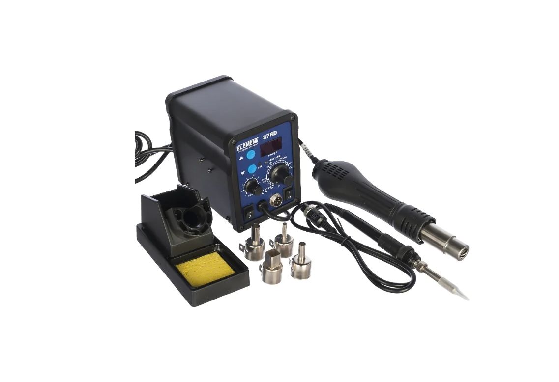 Паяльная станция ELEMENT 878D служит для удобного и безопасного проведения процесса пайки или демонтажа различных видов компонентов (в том числе чувствительных, в корпусах: SOIC, PLCC, QFP, BGA и т. д.). Аппарат выполнен в современном стиле, отличается небольшими размерами, за счет чего позволяет экономить рабочее пространство. Уникальная функция неактивного состояния позволяет экономить энергию: когда паяльник кладется на держатель, система приводится в резервное состояние готовности, как только фен снимается с держателя, система возвращается к установленным настройкам.