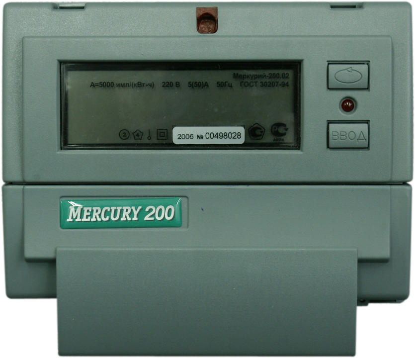 Меркурий 200.02. Класс точности 1,0, может вести учет четырех тарифов. Напряжение 220-230 В, сила тока 5-60 А. Работает при температурах от -40 до +55 °С. Можно регулировать нагрузку и контролировать потребляемое электричество. Производитель дает 3 года гарантии на эту модель, а срок службы оценивает в 30 лет. Проверки необходимо осуществлять раз в 16 лет.