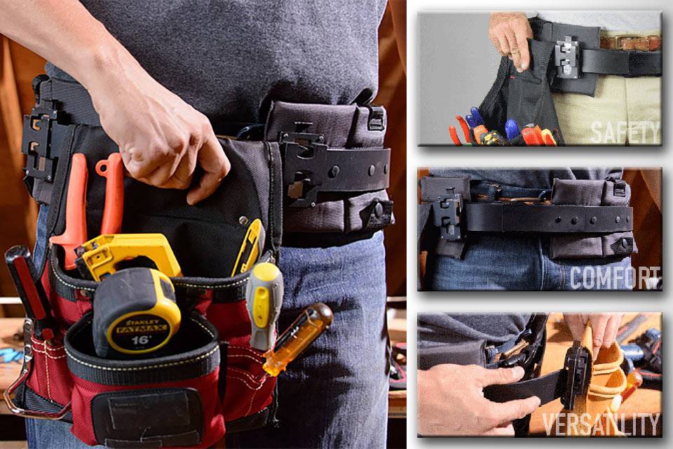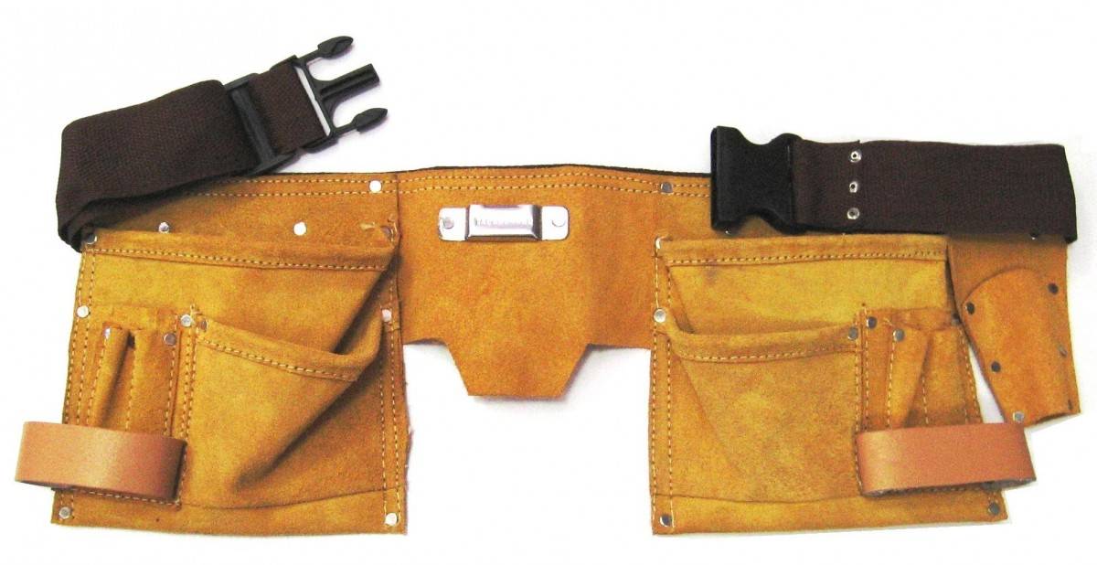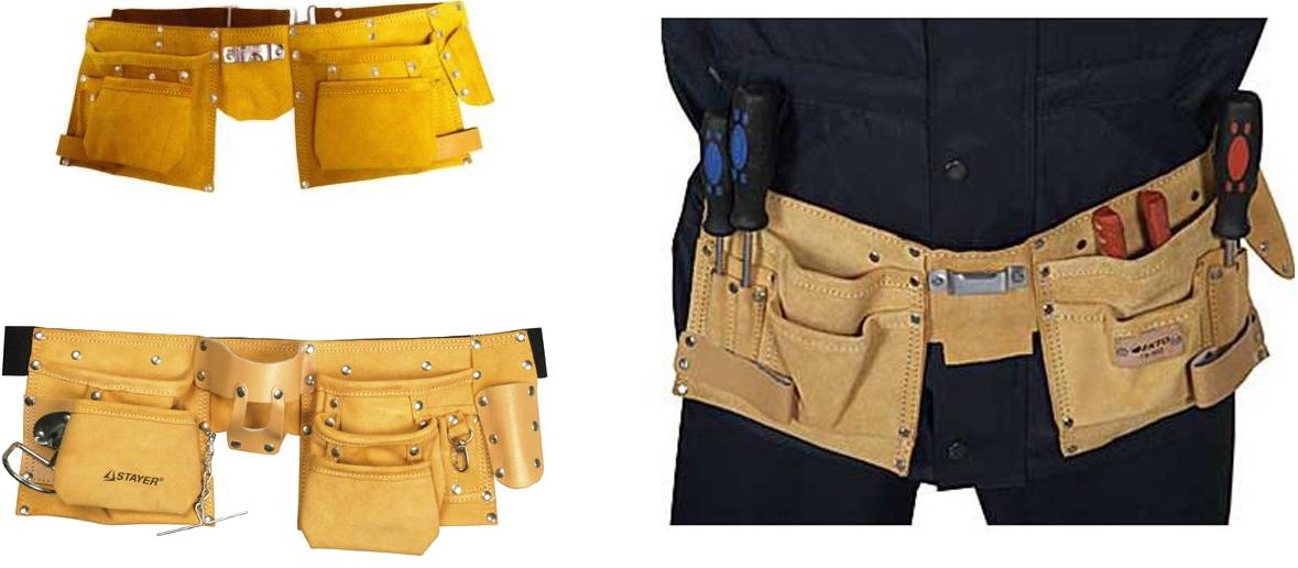 Поясными. Монтажный пояс для инструмента выглядит, как планшет небольшого размера, оснащённый кармашками, петлями и зацепами.