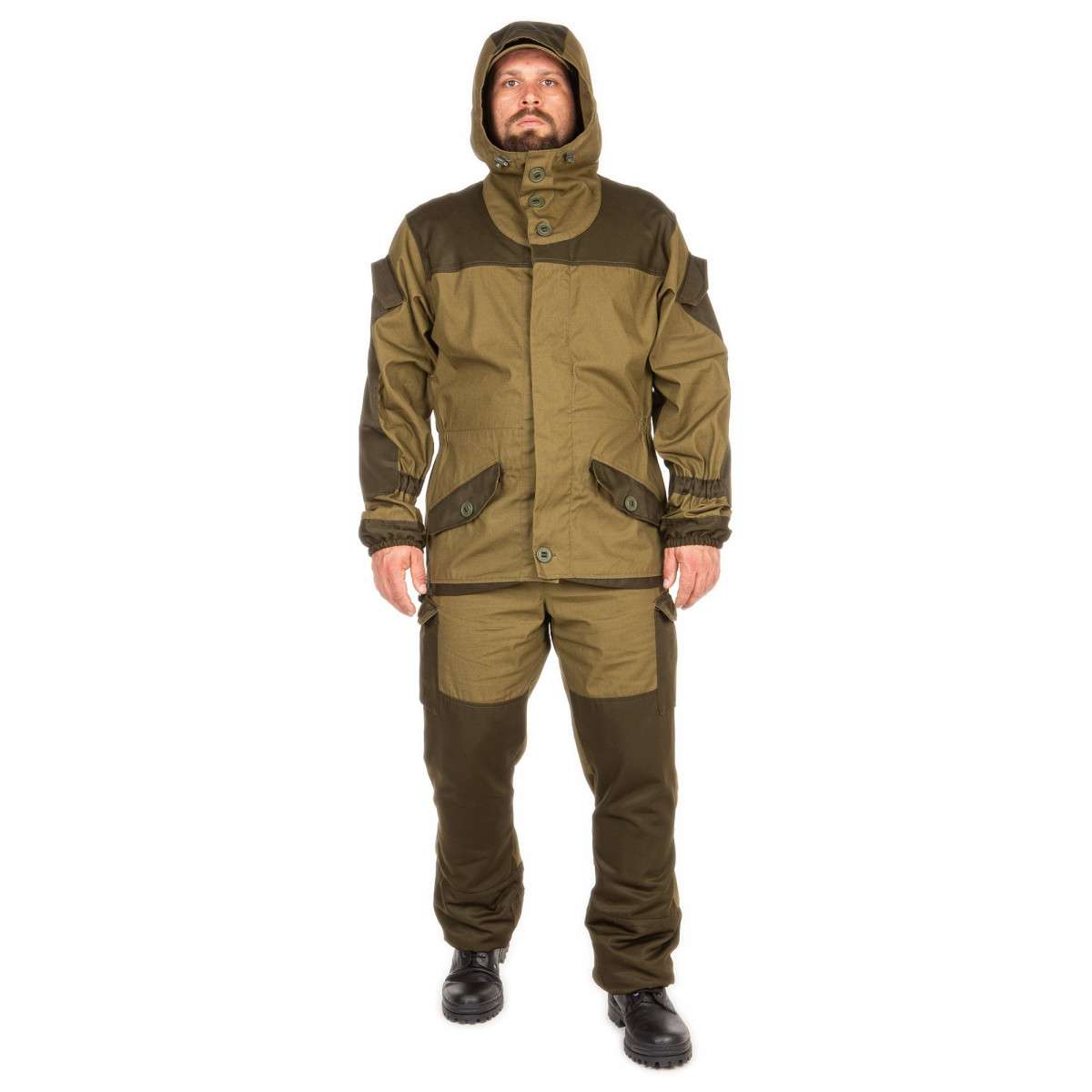 Костюм изготовлен из смесовой ткани (65% п/э, 35% — коттон), с плетением нити RipStop. Манжеты-напульсники рукавов, внутренние гетры на брюках и внутренняя рубашка куртки выполнены из бязи. Мягкий и приятный на ощупь материал обеспечивает повышенный комфорт при носке.