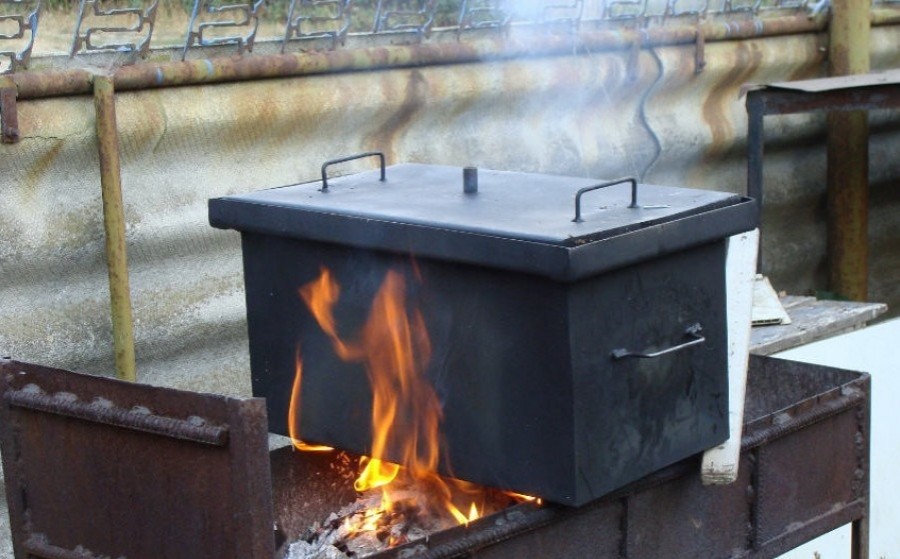 В таких аппаратах в коптильную камеру закладывается тлеющий древесный уголь. Он выделяет дым, который поступает в коптильную камеру. Увеличить его количество можно, положив сверху влажные опилки и щепу.