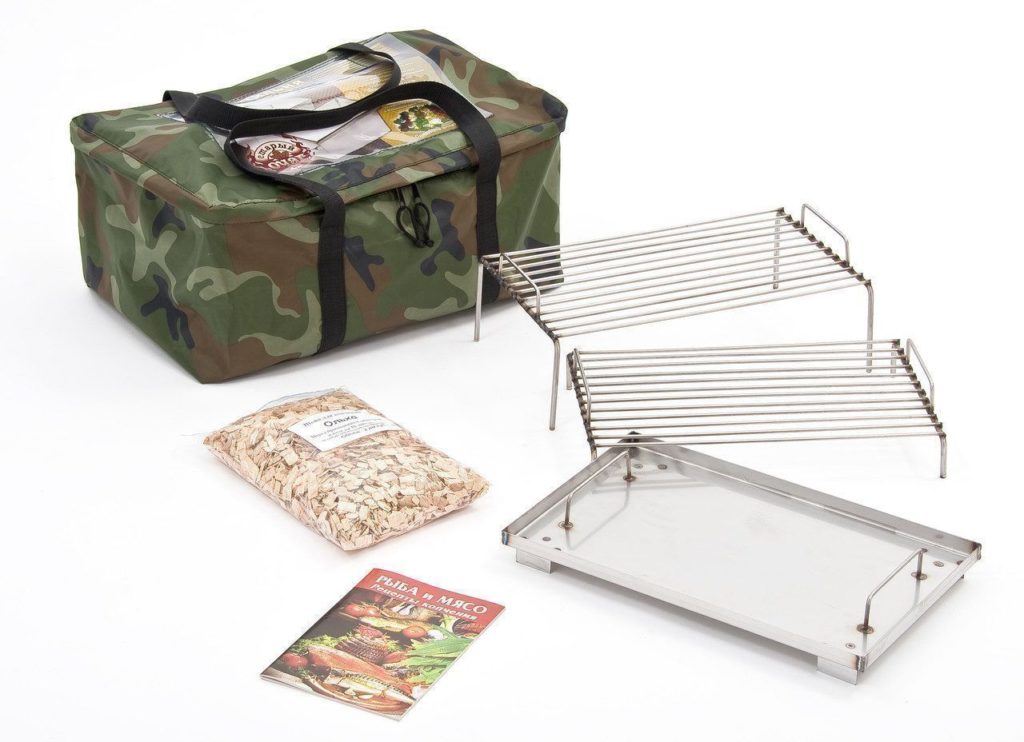 Коптильня с гидрозатвором, чо позволяет готовить как на открытом воздухе, так и в помещении. Но при открывании крышки, все равно нужно или выносить на воздух, или открывать окно. За один раз можно приготовить 2 крупных рыбин или 4 средних. В комплект входит 2 решетки, поддон для жира. Все части устройства хорошо очищаются. Для удобства переноски в комплект включена сумка.