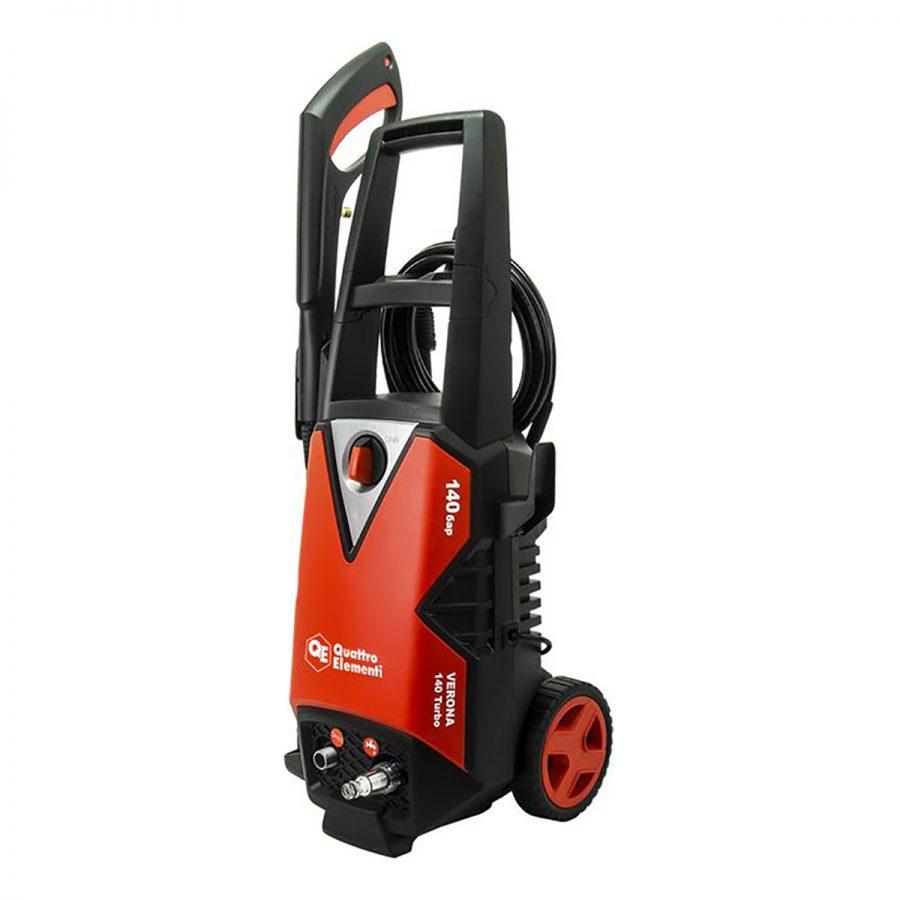 Модель QUATTRO ELEMENTI VERONA 150 Turbo 242-328, попавшая в топ 2022 года, имеет множество полезных функций и приспособлений, вот только напор воды не слишком сильный (100-150 бар). Зато есть функция самовсасывания жидкости, благодаря которой можно помыть автомобиль из бассейна или ведра. Предусмотрена система экономии электроэнергии Total Stop System и блокировка пистолета от несанкционированного включения. Если приобретать недорогую мойку с большим функционалом, можно остановиться на этой модели.