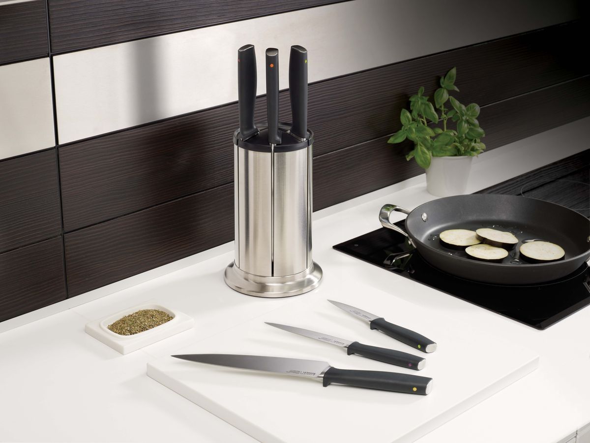 Следующий вариант – стандартный. Вероятно, это — первая картинка, которая придет вам в голову при словосочетании «хранение ножей». Подставка. Органайзер. Лоток. Блок. Названий много, а суть одна – емкость, наполненная пластиком, стеклом, деревом, пробкой — в зависимости от предпочтений.