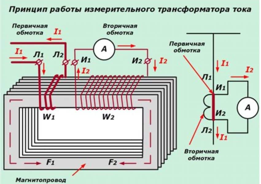 Основная задача токовых трансформаторов понизить (повысить) значение тока до приемлемой величины. Принцип действия основан на свойствах трансформации переменного электрического тока. Возникающий переменный магнитный поток улавливается магнитопроводом, перпендикулярным направлению первичного тока. Этот поток создается переменным током первичной катушки и наводит ЭДС во вторичной обмотке. После подключения нагрузки начинает протекать электрический ток по вторичной цепи.