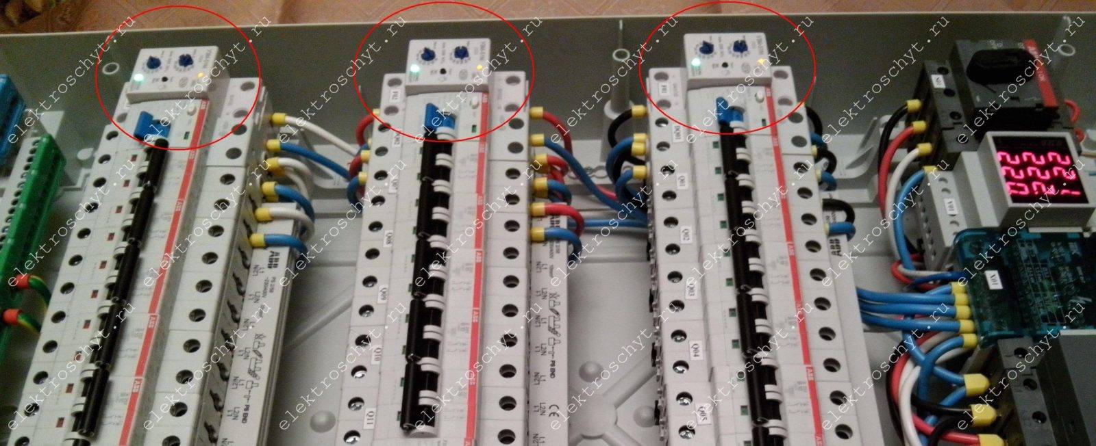 Пример установки УЗМ-51М в трехфазном щите для загородного дома, где УЗМ установлены в каждую фазу.