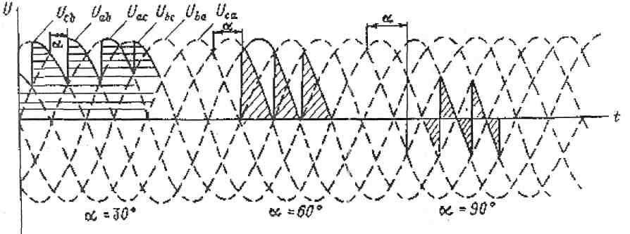 Рис. 7. Диаграммы работы трехфазного мостового УВ при различных углах