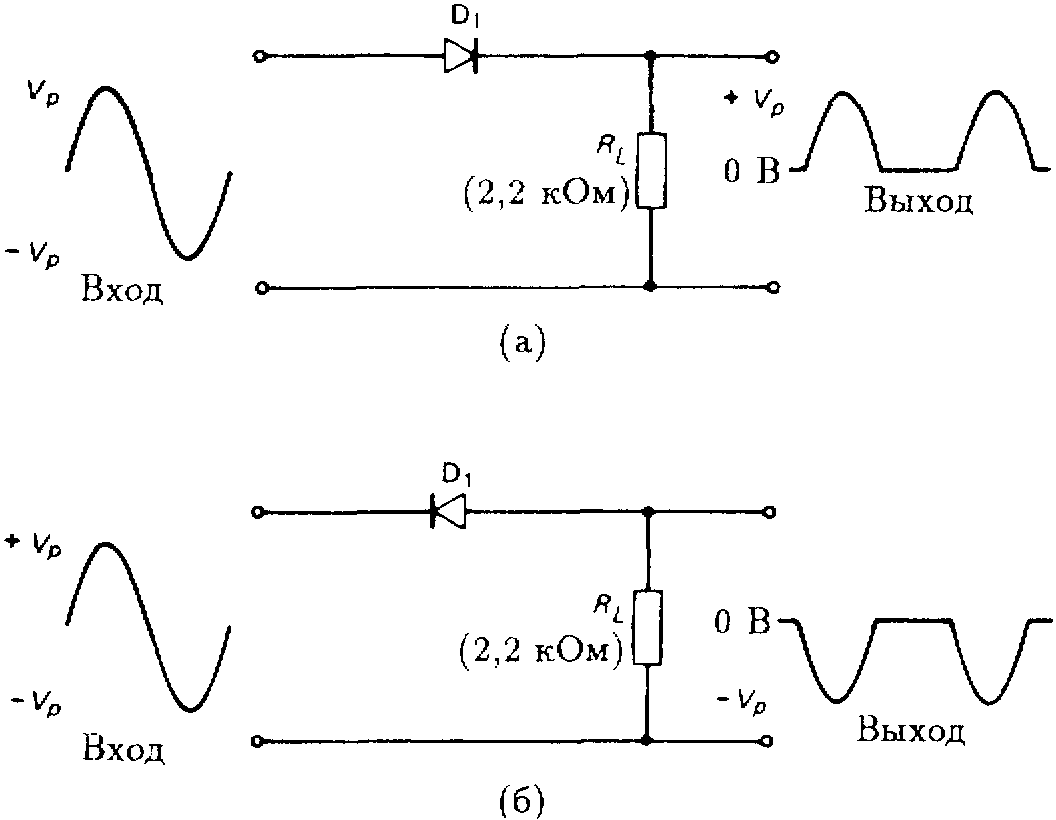 - в первом случае выпрямляется положительная полуволна входного напряжения, а во втором – отрицательная;