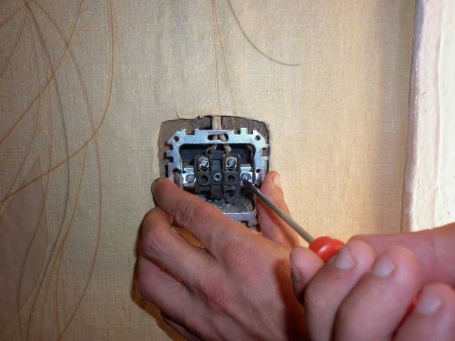 Следующим этапом будет удаление выключателя с места крепления. Чтобы извлечь его из пластиковой оболочки в стене, нужно ослабить два шурупа. Немного выкрутив их, вытаскиваем прибор из стены. Для отсоединения выключатель света от проводов ослабляем крепления и вытаскиваем их из зажимов.
