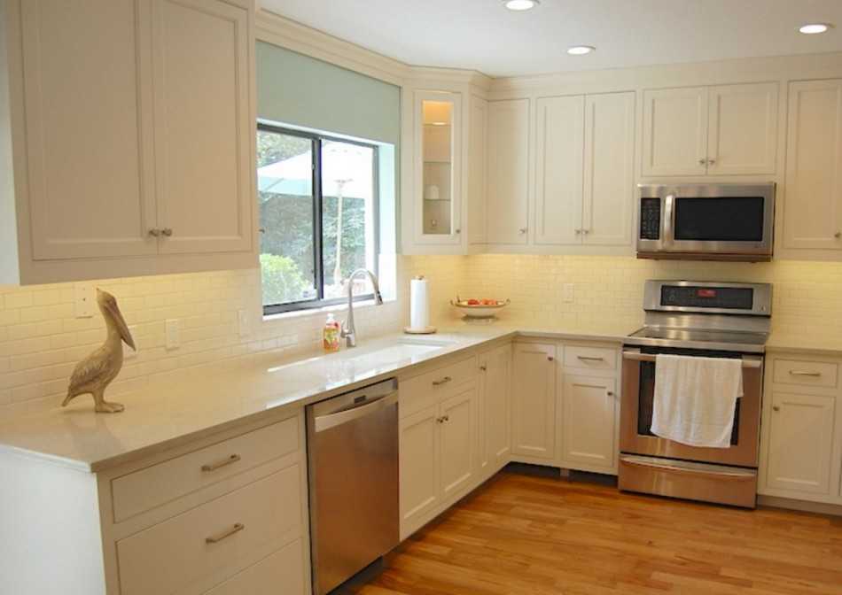 При выборе оттенков фасадов мебели для маленькой угловой кухни лучше использовать светлые тона — белый, бежевый, желтый, оранжевый и т.п. Очень хорошо смотрятся не только на фото белые поверхности, отражающие свет. А вот от темных и чересчур ярких красок стоит отказаться, так как они визуально уменьшают пространство.