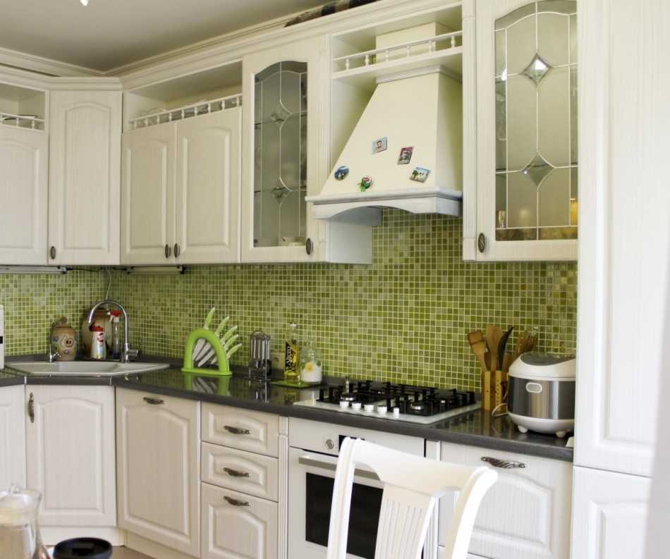 - Фартук. Рабочая фартучная зона нуждается в правильном выборе отделки. Популярное решение – использование керамической плитки, мозаики, пвх-панелей, закаленного стекла, моющейся краски или декоративного камня.