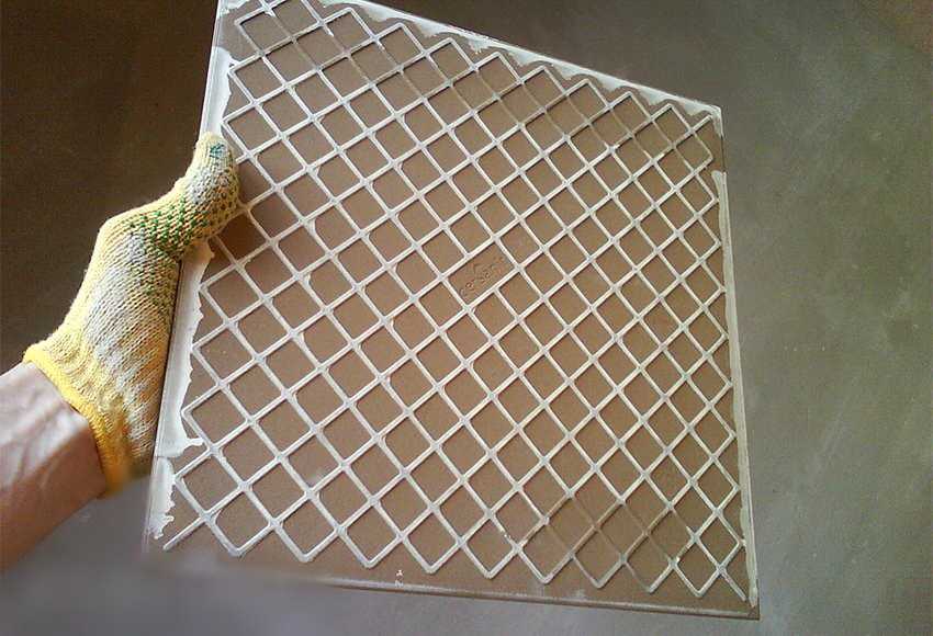 Помните, что напольные плиты будут испытывать очень большие нагрузки в плане веса и давления, поэтому слой клея должен быть достаточным. Большинство производителей указывают в качестве оптимальной толщины порядка пяти миллиметров. Клей следует укладывать на плитку с помощью гребенчатого шпателя. Наносить его нужно равномерно и при этом максимально ровно.