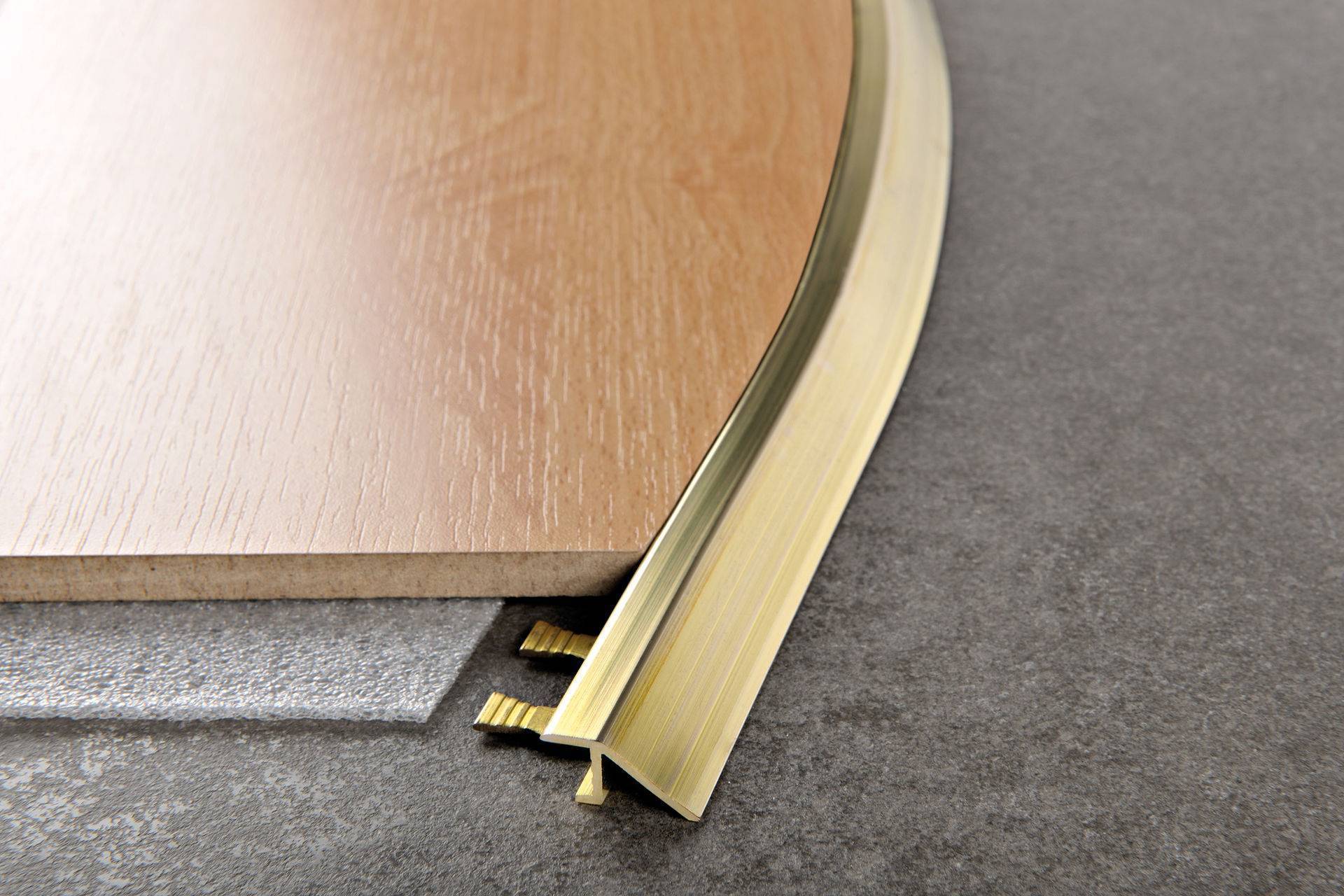 Пластиковый порог тоже потребуется криволинейный. Они имеются в продаже, но имеют незначительный изгиб. Чтобы подогнать под нужную форму, его сначала размягчают, используя строительный фен, можно просто опустить в горячую воду на 20 минут, температура должна быть 70 градусов. После таких процедур его можно легко согнуть так, как вам нужно. Порожек имеет две части. Первая фиксируется к полу по линии стыка. С той стороны, где уложен ламинат, нужно обязательно оставить просвет для формирования температурного шва – это позволит избежать деформирования. Вторая часть крепится к первой на клипсы.