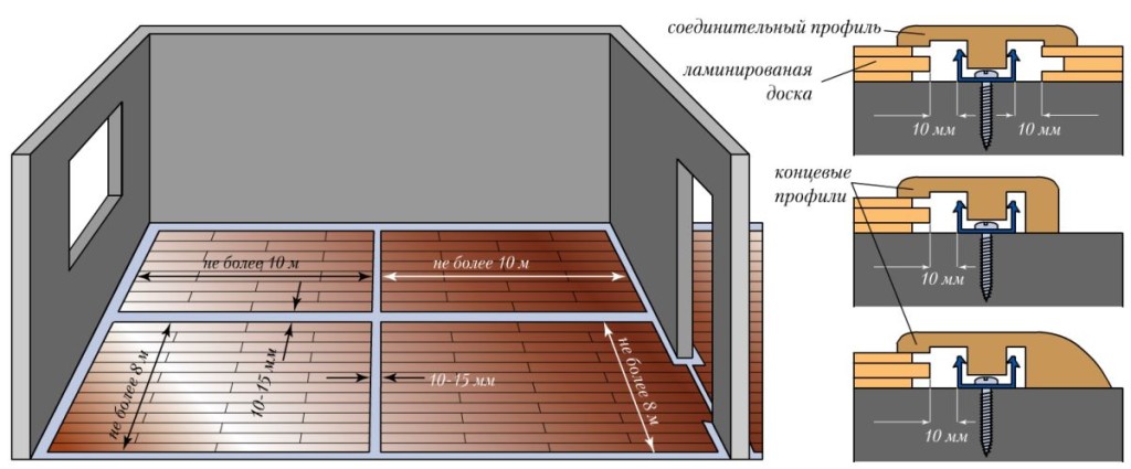 При укладке больших площадей следует учитывать что ламинату необходимы компенсационные швы, предотвращающие деформацию планок и повреждение замков при изменении влажности. Обычно максимальная площадь без компенсационных швов составляет – 25 м², но некоторые производители заявляют и до 100 м². Точные данные указаны в инструкции.