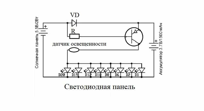 В светлое время суток датчик освещенности под воздействием естественного освещения выступает в роли токоограничивающего резистора, запирающего цепь питания светодиодной панели. С наступлением темноты фотоэлемент перестает генерировать электроэнергию, но за счет диода VD накопленная в емкости аккумулятора электроэнергия не растрачивается на обратный разряд.