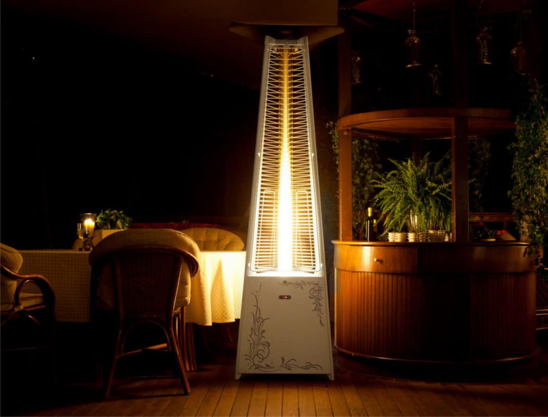 Газовое пламя способно давать более мягкий длинноволновый спектр инфракрасного излучения, что приятнее для глаз, но медленнее нагревает окружающие предметы. Сами горелки имеют открытую или грибовидную конструкцию. Открытые пропановые нагреватели представляют собой прозрачную стильную колбу в виде пирамиды, а закрытые сконструированы по типу газовых грибов, где роль излучателя играет стальная труба, разогреваемая пламенем до красна. Пропан может подаваться в стационарные обогреватели по магистральному скрытому газопроводу – это самый экономичный вид обогрева патио-зоны. Однако, подключение к коммуникациям лишает прибор мобильности. Для придания газовой горелке полной автономности, ее оборудуют баллоном на 30 литров. Полной заправки хватает на 10 часов работы.