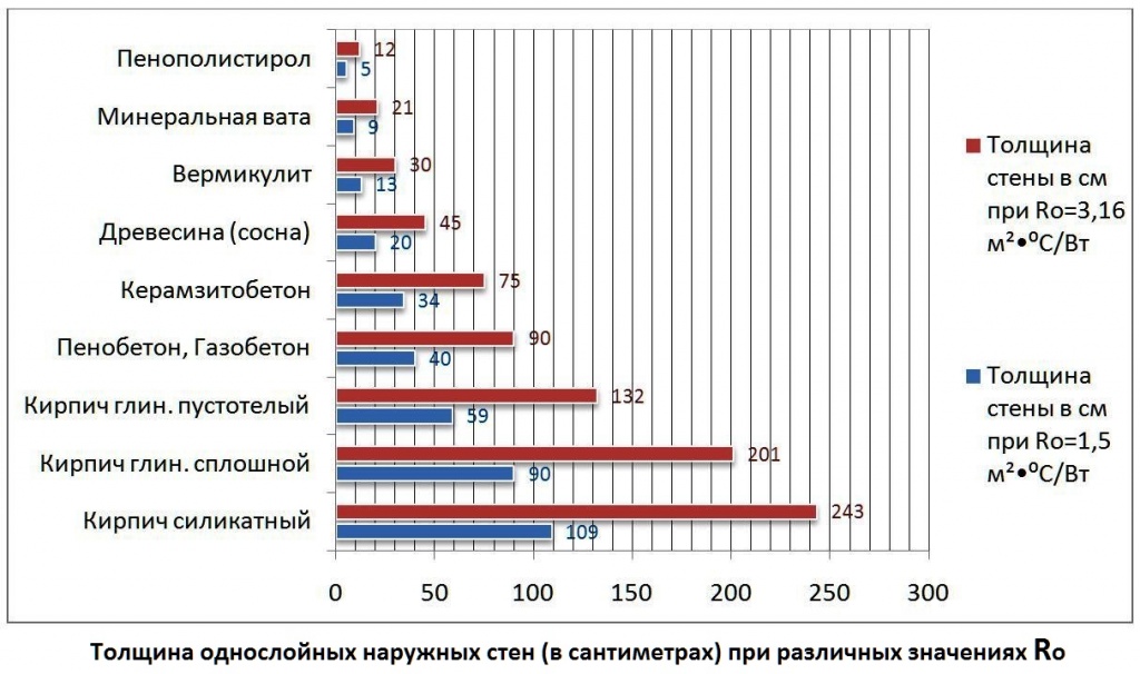 Рассмотрим подробнее, какую толщину однослойных наружных стен из различных материалов необходимо принимать в зависимости от сопротивлений теплопередаче, требуемых по 1 и 2 вариантам: