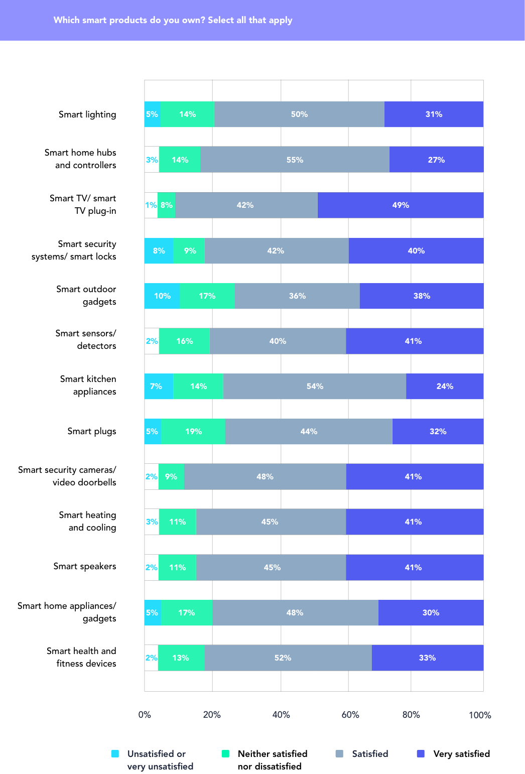 Учитывая их популярность, неудивительно также, что большинство людей были довольны своими умными телевизорами, телевизионными плагинами и умными динамиками. В целом потребители довольны своими интеллектуальными технологическими покупками.