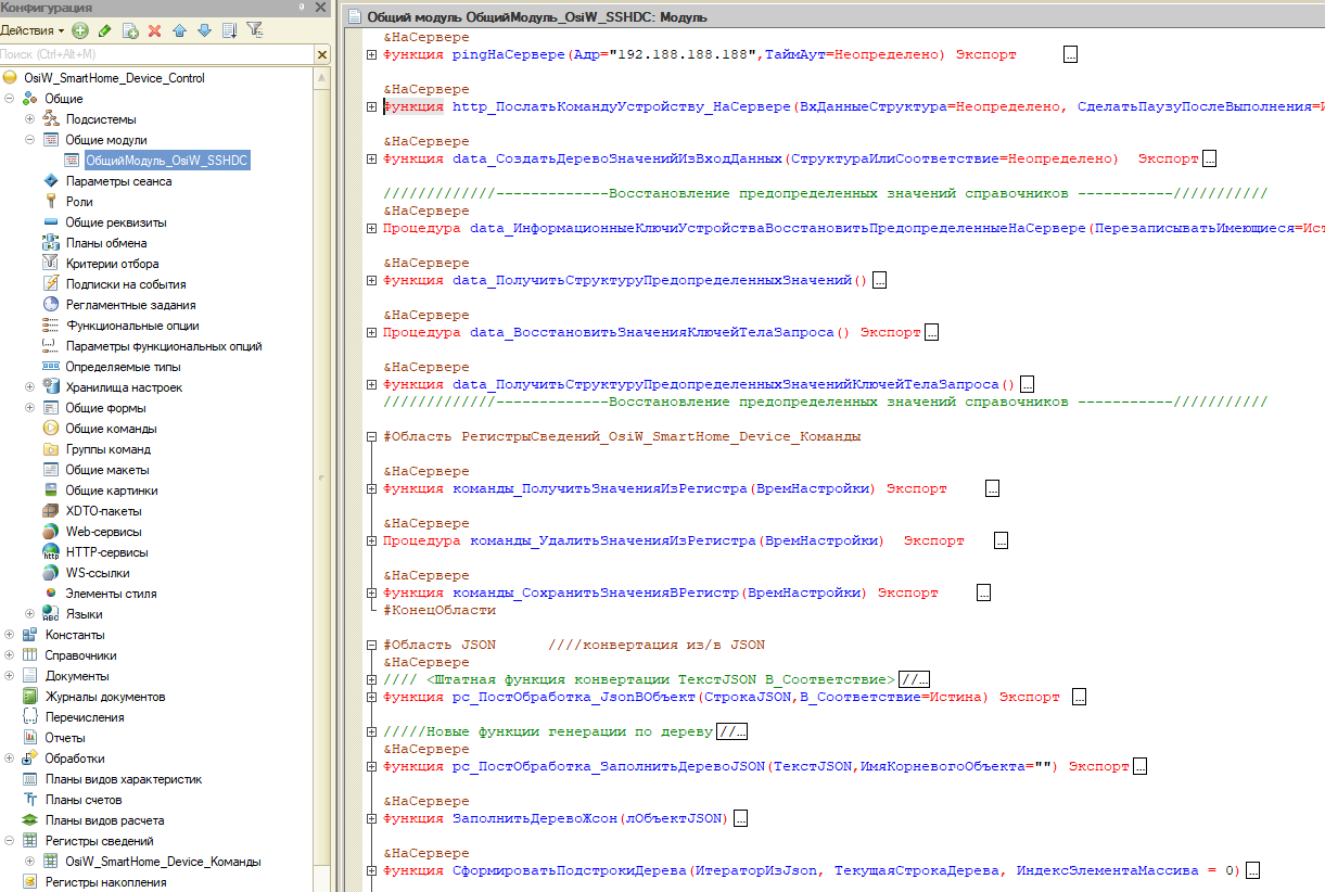 Здесь хранятся сами умные устройства. Имеют дополнительные реквизиты «IP адрес» и «Порт». Табличную часть «Команды устройства», которые можно послать в адрес устройства для исполнения.