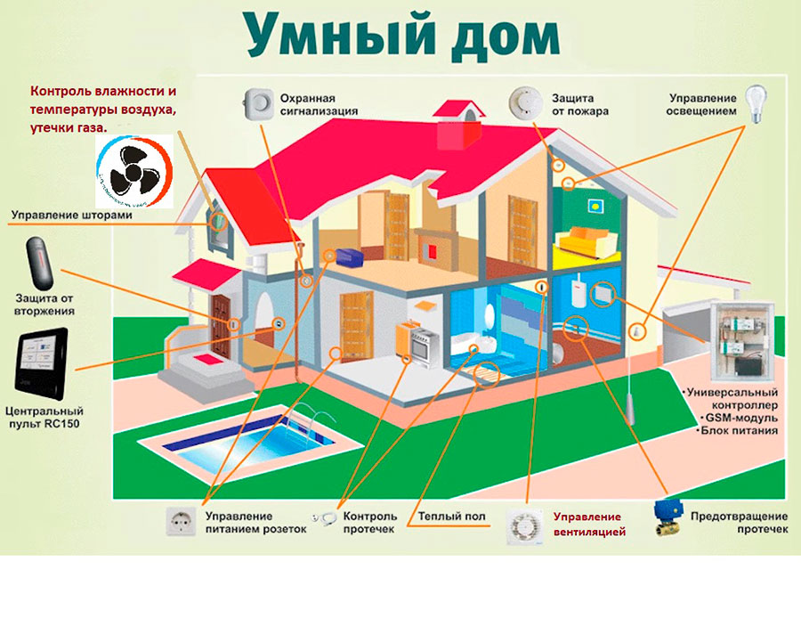 - отопление и вентиляция (кондиционирование) — оптимизация микроклимата в помещении, благодаря детекторам температуры и влажности;