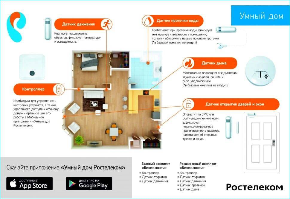 Подобное оборудование в различной комплектации предлагает компания Rubetek. Самым дешевым оказывается набор умного дома, состоящий из видеокамеры, датчиков движения и протечки. Оборудование беспроводное и работает через Wi-Fi. Его цена в среднем составит 10 000 рублей. Для однокомнатной квартиры такой аппаратуры будет достаточно.