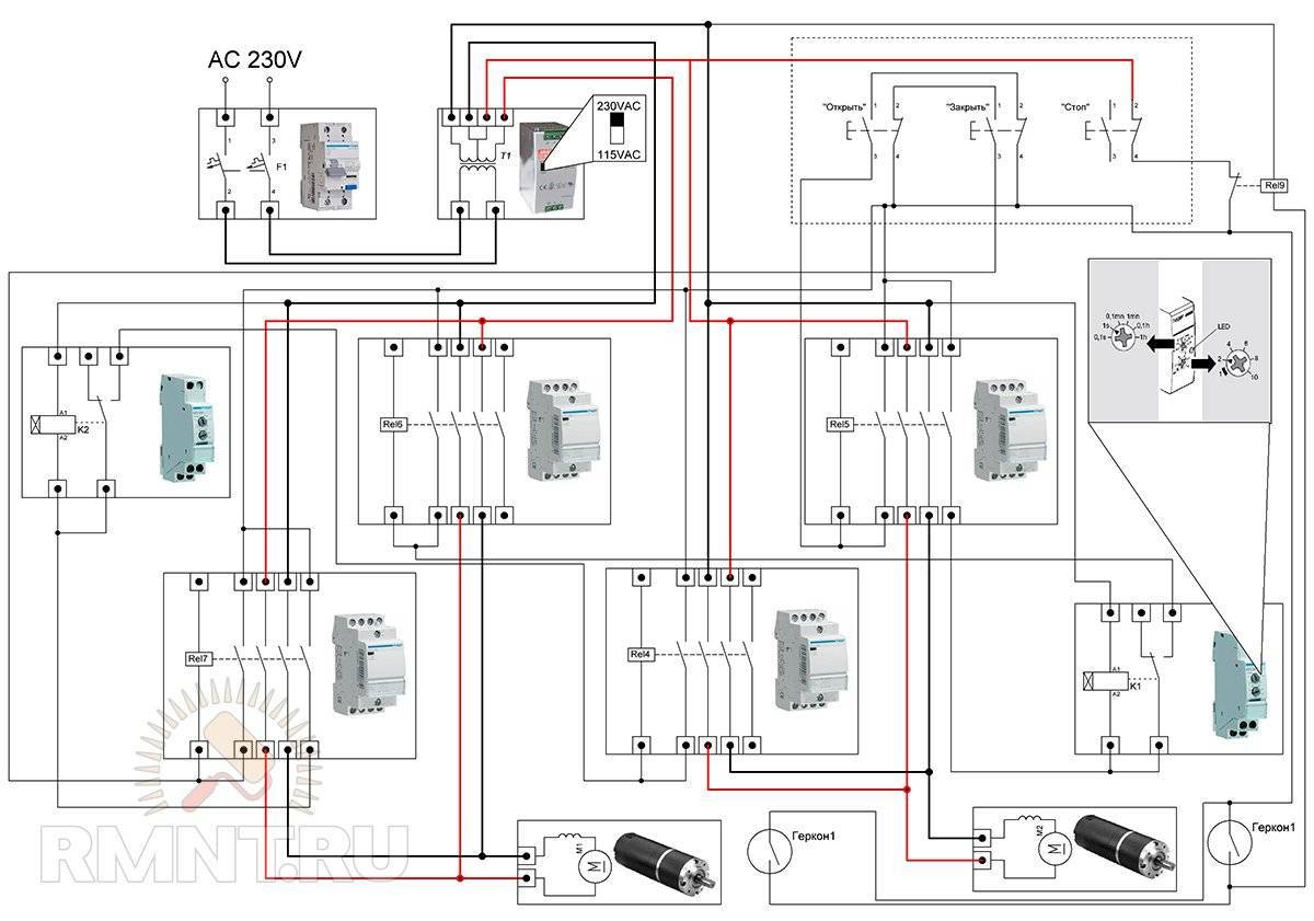 Управление двигателем выполняется по классической реверсивной схеме, но есть одна деталь. Понятно, что на распашных воротах имеется ограничительная планка, поэтому створки должны складываться в определённом порядке. При отрывании первой начинает движение створка без планки, но закрываться она должна последней. Реализовать это можно разными методами, наиболее надёжный — реле с задержкой включения.