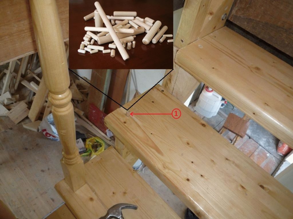 Нанесение разметки подразумевает каждый элемент – перила, ступени, столбцы. Глубина отверстия должна равняться половине диаметра шканта. При установке крепежа, обмазанного клеем, нужно соблюдать следующий порядок: сначала ступени, потом перила.