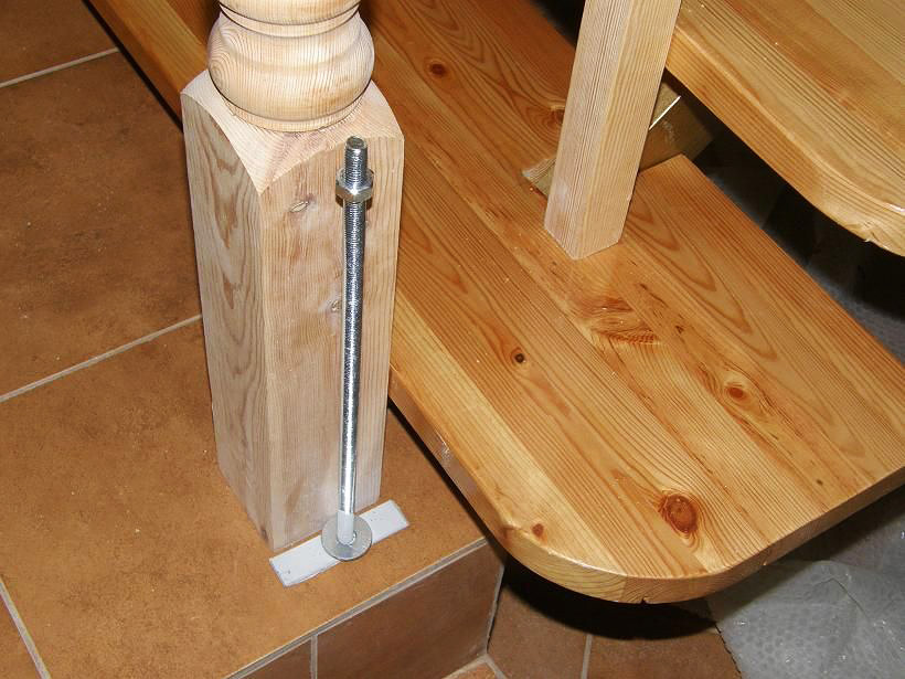 Установка опор при помощи шпилек требует наличие отверстий необходимых размеров (под шпильку длиной десять сантиметров). Один конец шпильки вкручивается в дерево, а второй в специальную нарезку резьбы. Однако ввинчивание крепежа чаще всего осуществляется в торец или на тетиву лестничной конструкции.
