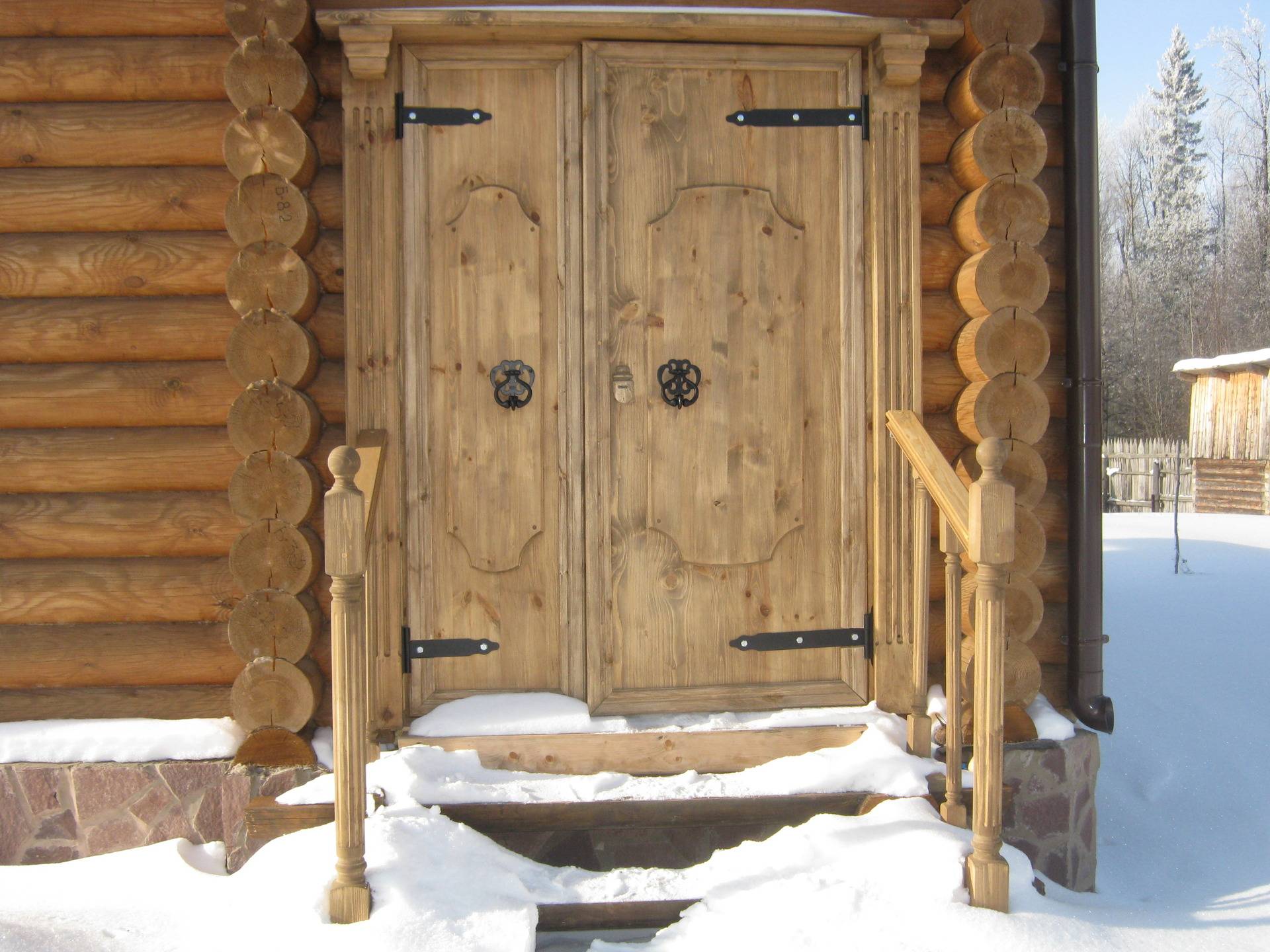 Деревянные изготавливаются из липы, лиственницы, дуба, осины. Такие двери не ведет от влаги. Так же полотно пропитывают антисептическим раствором от вредителей, без химической составляющей.