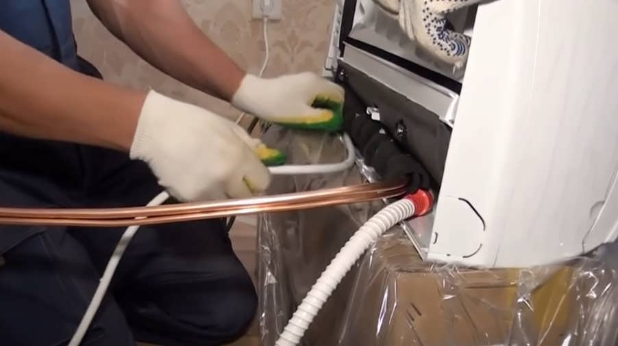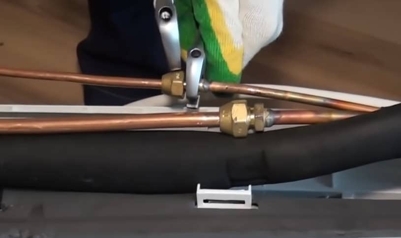 С клемм наружного модуля снять все защитные крышки из пластика, после этого аккуратно подключить все кабели, идущие от внутреннего блока. Выполнить монтаж трассы сплит-системы, не забыв выполнить теплоизоляцию на трубки. Чтобы в них не попадал мусор, концы можно заклеить армированным скотчем. Хомутами прикрепить трассу к стене, трубки обрезать, но должен оставаться запас в десять сантиметров, на них крепятся накидные гайки. Снять фаску с помощью специального риммера. Накидными гайками прикрепить трубки к штуцерам внешнего и внутреннего блока. Потом аккуратно прикрепить дренажную трубку, для этого можно взять пластиковые хомуты.