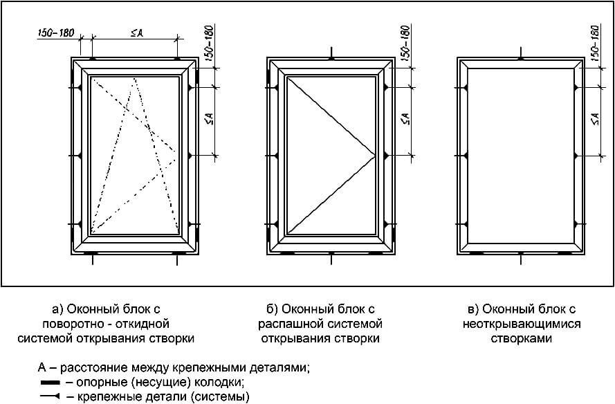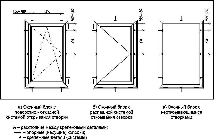Примеры расположения опорных (несущих) колодок и крепежных деталей в одностворчатых оконных блоках