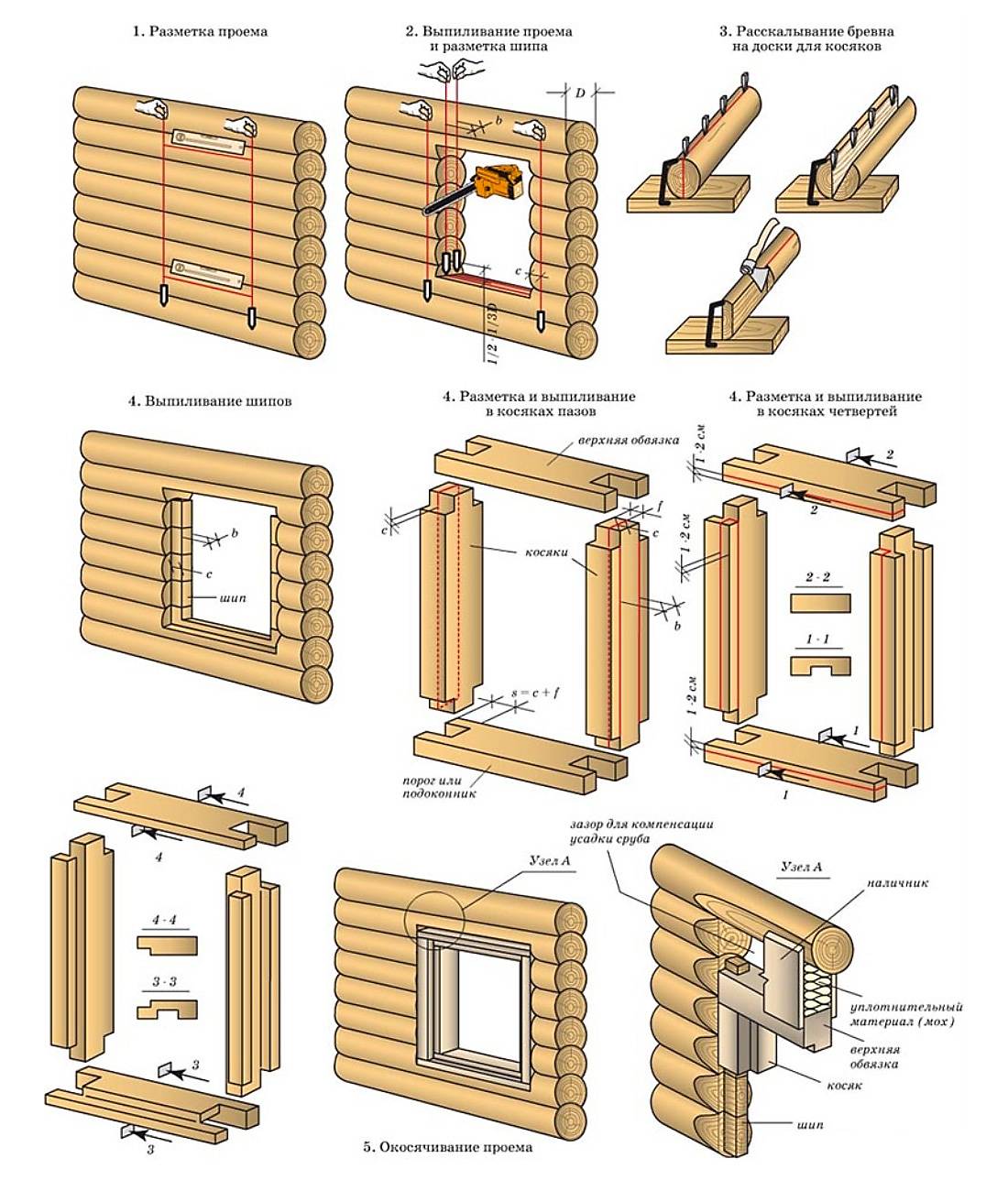 - в колоду. Шип располагается на торцах бревен оконного проема, а вот паз — в стойках обсады.