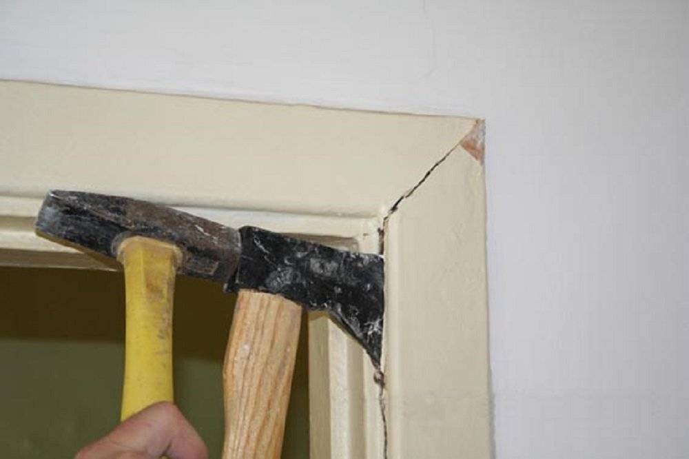 - Если демонтируется короб из металла либо деревянная коробка прикреплена к проему анкерами, то их проще отпилить болгаркой, как и металлические стойки.