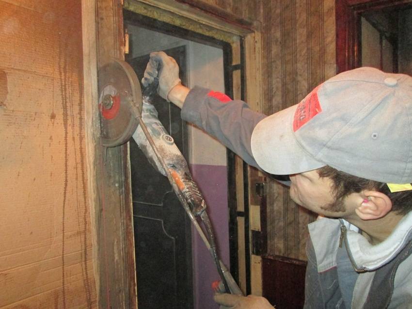 - При помощи болгарки или ножовки по дереву надрезают старую дверную коробку.