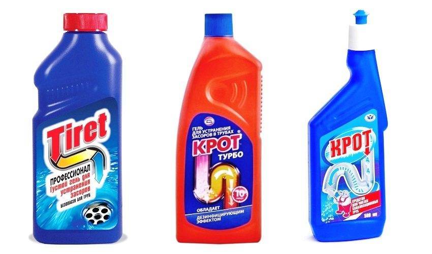 Современная химическая промышленность предлагает разнообразные специальные средства, которые дают быстрый и качественный результат очистки канализации. Достоинством такого метода является высокая эффективность препаратов и удобство их использования. Среди наиболее популярных химических средств, получивших хорошие отзывы, можно назвать «Крот», «Доместос», «Тирет» и Тирет турбо, а также «Мистер Мускул» и другие.