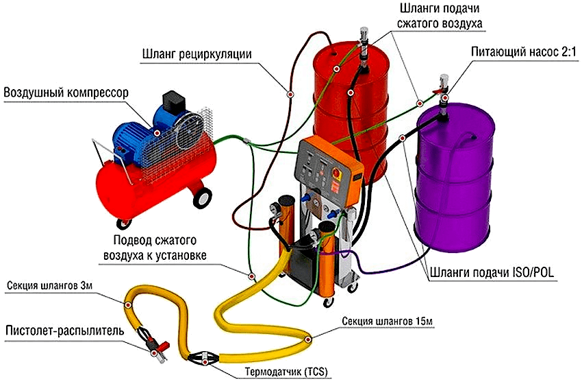 Нанесение покрытия пеной своими руками вполне под силу домашнему мастеру с начальными навыками покраски распылителем. При работе с бытовыми установками начального уровня, как правило, справляется один человек. При установке обрешетки и при работе с высокопроизводительными устройствами с длинными шлангами для их переноса, а также перемещения емкостей с компонентами, потребуется помощник.