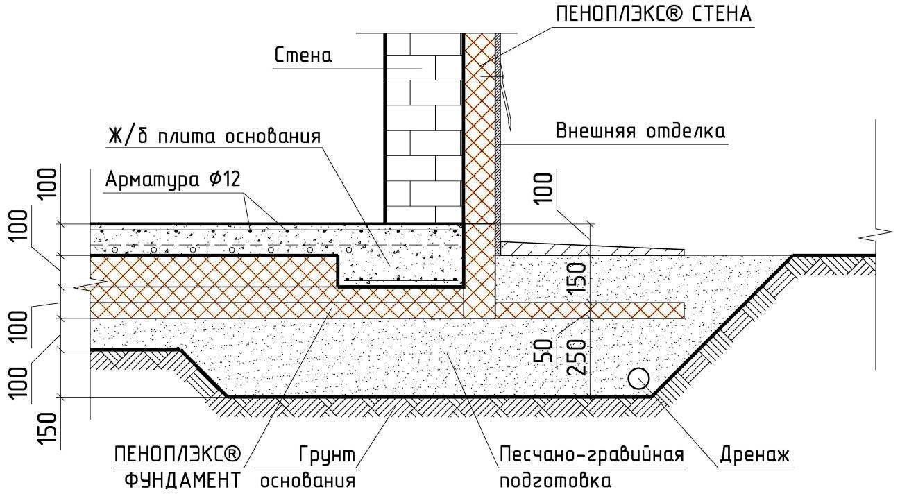 Высота плиты может быть от полуметра. Промерзание по периметру самое опасное для фундамента. Потому, в основном, утепление крепится именно по боковым поверхностям.