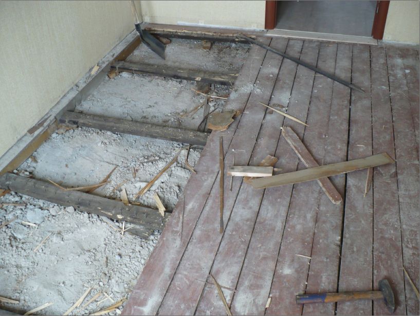 - демонтируется старое напольное покрытие, убираются стяжка, если имеется, и старый утеплитель;