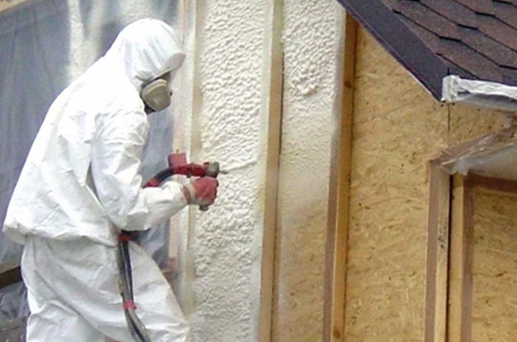 Нанесение пенополиуретана на стены дома осуществляется с помощью компрессора со шлангом, что позволяет обеспечить однородность покрытия и отсутствие швов. Отличные показатели эластичности материала при его нанесении делают пенополиуретан одним из лучших теплоизоляторов для утепления стен зданий сложной формы, когда использовать обычные плитные и рулонные изоляторы не представляется возможным.