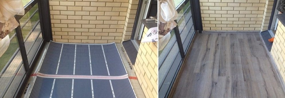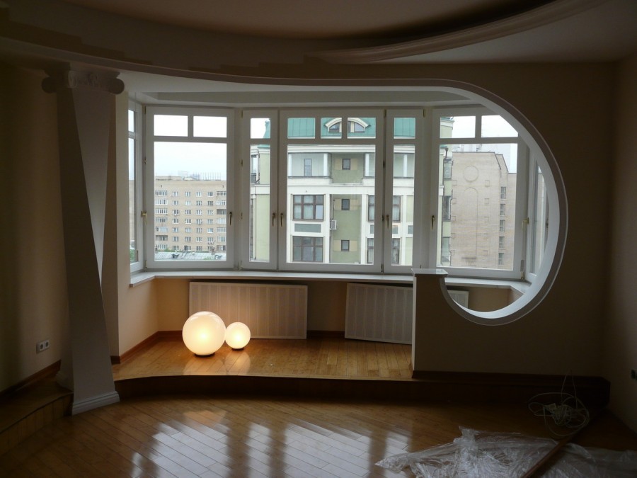 Полы лоджий опущены значительно ниже уровня пола примыкающего помещения. Эту разницу придется устранить, подсыпав пол керамзитом до уровня низа коробки входной двери, с последующим устройством цементной стяжки. Поверх нее можно смонтировать электрический обогрев пола из пленочных нагревателей (как вариант), и положить сверху ламинат.