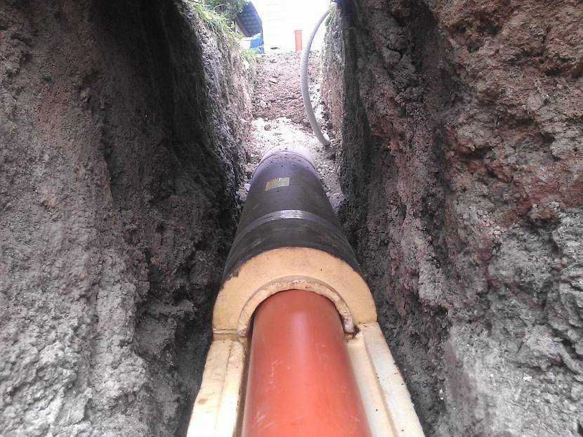 Траншеи с канализационными трубами засыпают сначала песком на высоту около 0.2 м, затем землей. В регионах с очень холодной зимой теплоизоляцию в виде скорлупы из пенополистирола дополняют утепляющим кабелем, поместив его под оболочку.