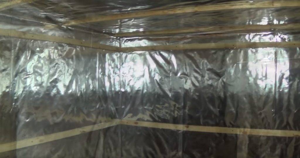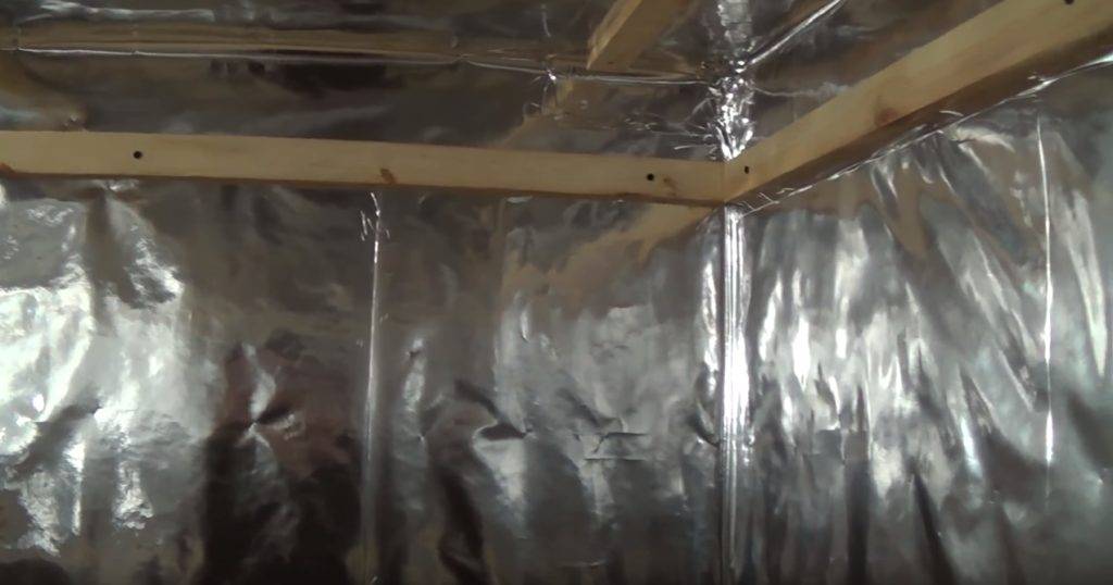 - Если теплоизолятор покрыт фольгированным слоем, то этот пункт можно опустить. Если фольга крепится отдельно, делать это нужно внахлест 20‒25 см, чтобы напуск с потолка заходил на стены, со стен ‒ на пол.