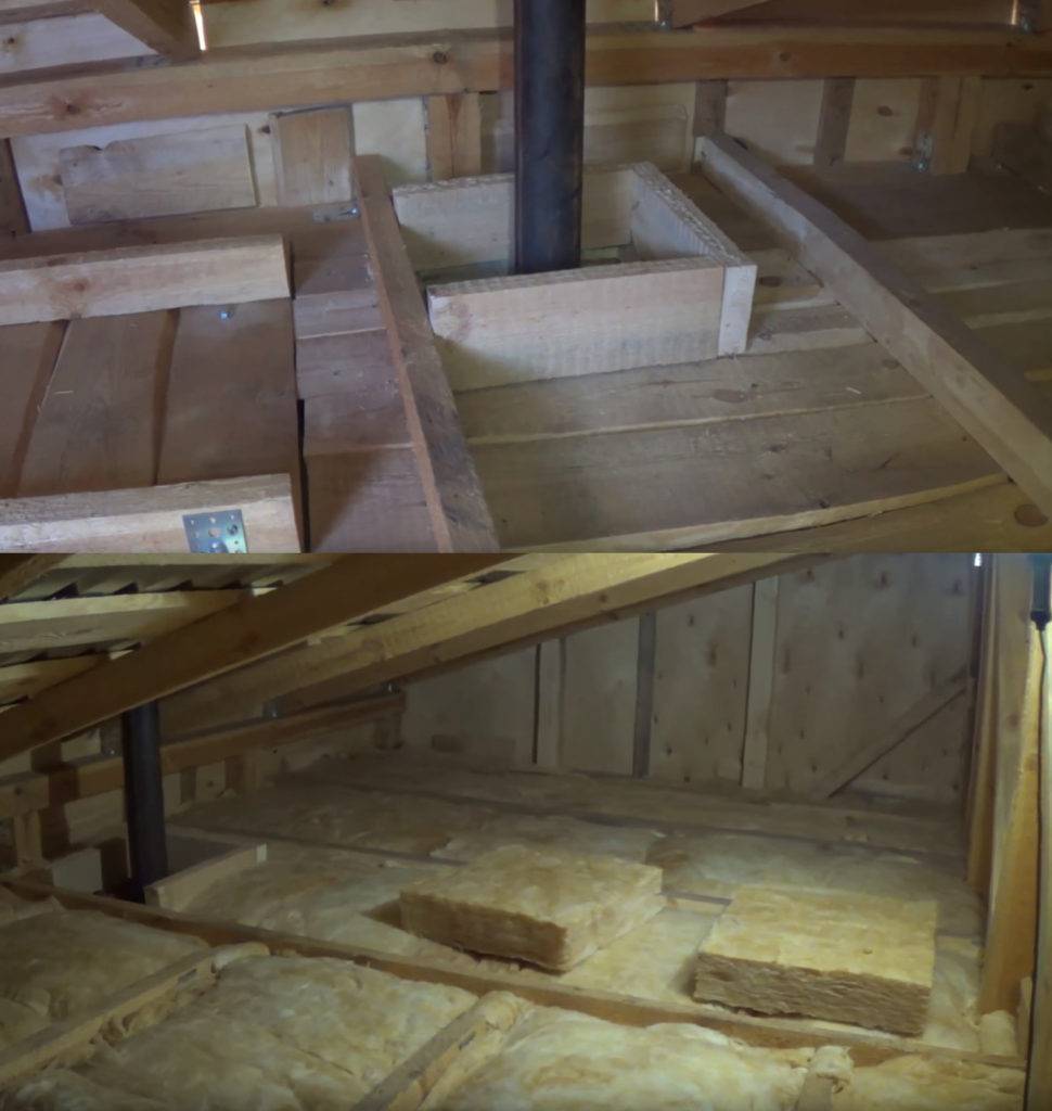 Мой рассказ про то, как правильно обшивать баню вагонкой будет неполным, если не упомянуть про утепление крыши со стороны чердака. Тут все довольно просто — используя плиты ISOVER, уложил их между балками, которые удерживают доски чернового потолка.