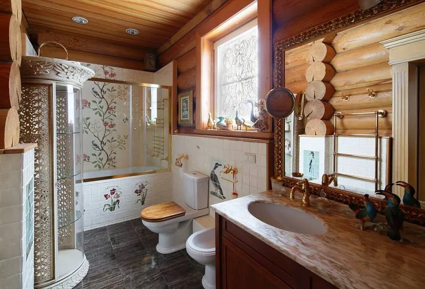 Интерьер кантри в загородном доме смотрится волшебно, для отделки «мокрых зон» можно использовать плитку с деревенским рисунком, она отлично сочетается с фактурой дереваИсточник eto-vannaya.club