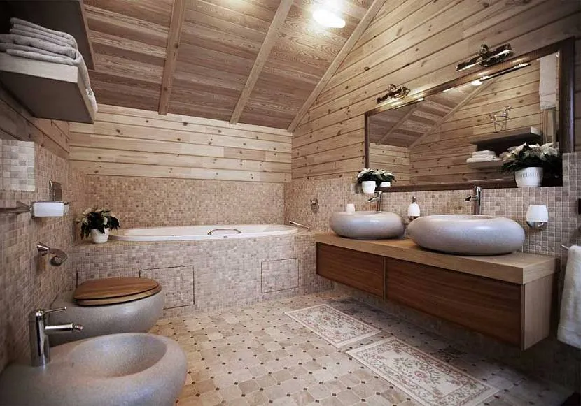 Завершающая отделка такого помещения должна начинаться лишь после того, как вы решите, что вы желаете видеть в итоге таких работ: экзотическую ванную в настоящем деревенском духе или интерьер, практически не отличающийся от городского. С современным оформлением особых вопросов не возникнет. Выбирай себе стиль, приобретай материалы и за дело, а вот попытаться сохранить первобытную атмосферу намного сложнее. Чтобы придать ванной очарование простоты, ее можно обставить деревянной мебелью и украсить специфическими, для деревенского быта, аксессуарами. Вот только подбирая такую мебель, учитывайте, что стандартно сделанные варианты не подойдут, поэтому ищите предметы защищенные обработкой от разрушения влагой. Если вы не нашли ничего подходящего самостоятельно, покройте мебельные поверхности эмалью, вскройте лаком или пройдитесь по ним грунтовкой.